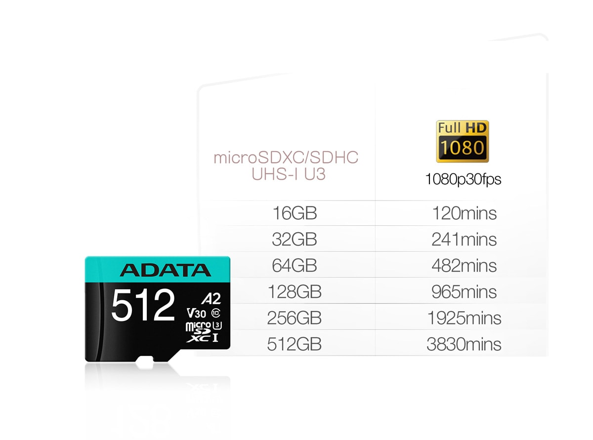 Pritaikant didelio greičio UHS-I U3 specifikacijas, Premier Pro atminties kortelė palaiko aukštos raiškos Full HD, 3D ir 4K Ultra HD video įrašymą. Ji atitinka V30 (video greičio klasės) specifikacijas, o tai reiškia, kad gali įrašyti minimaliai 30MB video per sekundę, kas idealiai tinka vaizdo registratoriams bei judesio kameroms.